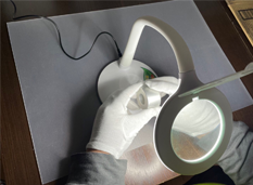 製品のキズやダコン、汚れ等がないかの目視検査をする作業